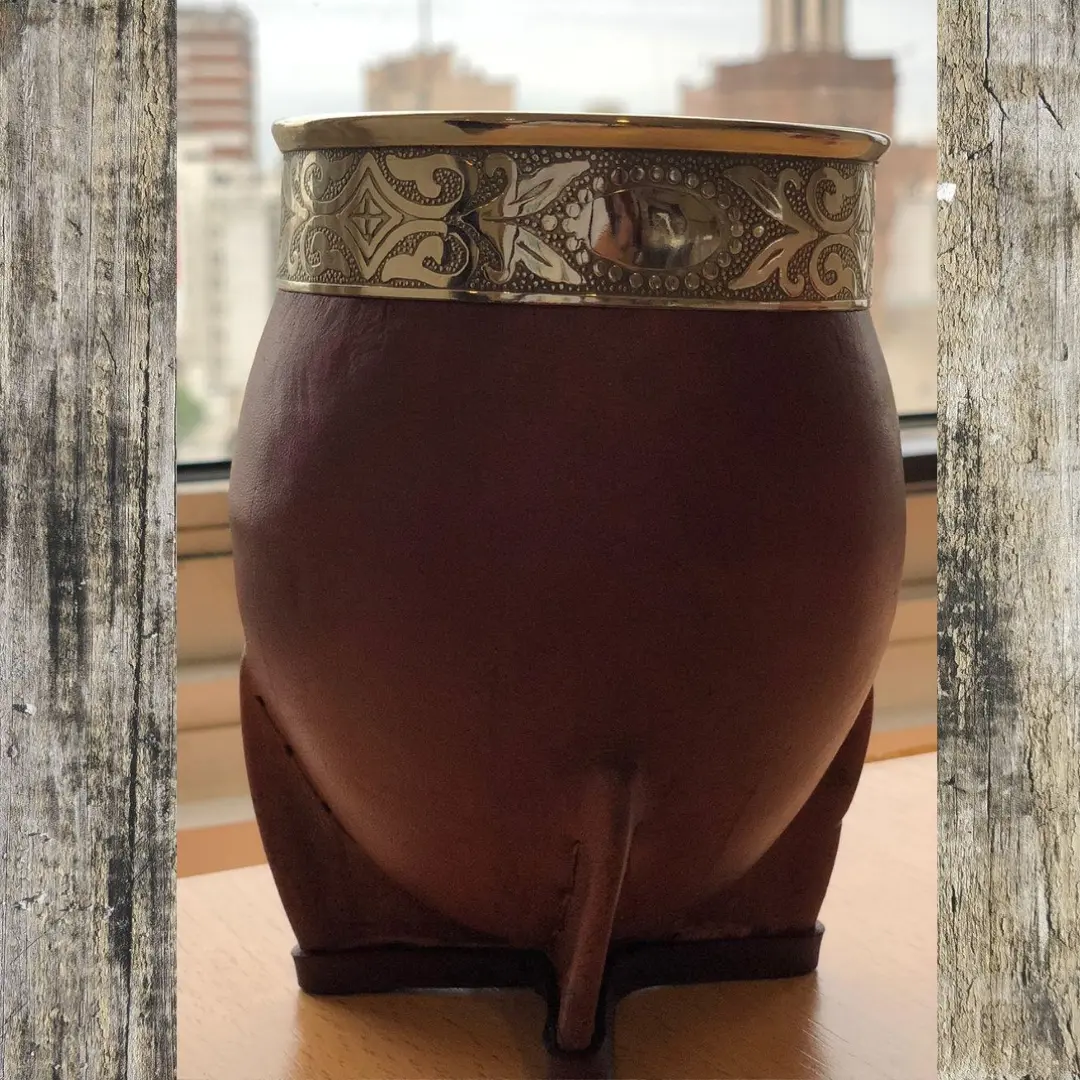 Mate imperial abstracta de Calabaza con virola de acero forrado en cuero vacuno de calidad premium